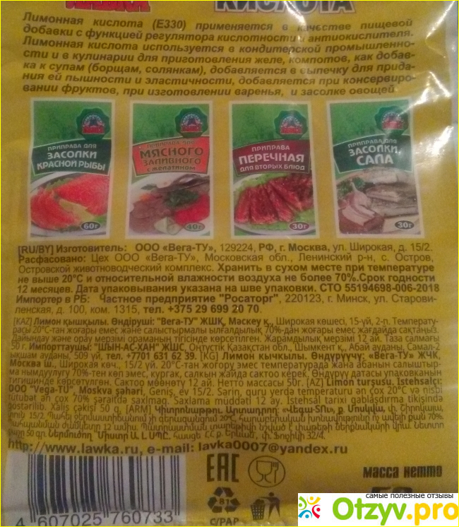 Раньше в продаже никогда не встречала данную от производителя "Лавка пряностей", покупала те, что были в ассортименте. За 50 граммовую упаковку отдавала в среднем 30-50 рублей. В этот раз сын принес из магазина вот эту кислоту, выбрал которую он исключительно по цене. Решив, что не нужно переплачивать за название, если состав везде одинаковый.
