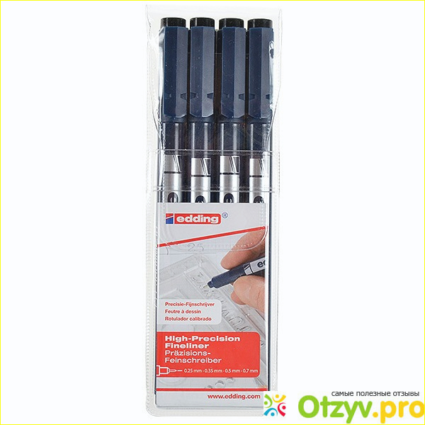Производят эти ручки в Германии, они отличаются высоким качеством и разнообразными характеристиками. Чернила в линерах - светостойкие, водостойкие, они не смываются, не стираются, во время рисования краска не растекается, не растирается. Использовать лайнеры edding можно в сочетании с акварелью, цветными или акварельными карандашами, маркерами для рисования и многими другими материалами. Примечательная особенность: капиллярная ручка edding прекрасно ложится поверх простого графитового карандаша, так что первоначальный набросок можно даже не стирать.