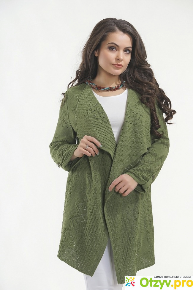 2. Вообще второй за необходимостью вещью для меня являются джины, но к сожалению на данном сайте, штанов нету вообще. Пришлось их заказать в другом месте, а к ним здесь я выбрала кардиган. Девочки это такая крутая вещь. Моя мамочка от нее до сих пор в восторге, не может нарадоваться. Изделие выполнено в очень красивом болотном цвете, с очень красивой ажурной вязкой, смотрится очень стильно, фасон свободный. Кстати в состав ткани входят шерсть тридцать процентов (30%), и пан семьдесят процентов (70%). Длинна изделия семьдесят сантиметров (70см.). Цена две тысячи сто рублей (2100р).