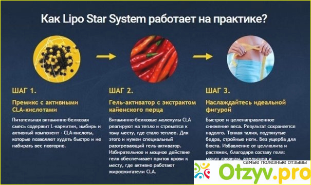 Lipo Star System является смесью витаминов и белков, а активным компонентом его являются кислоты CLA, способные сдерживать разрастание жировой ткани и стимулировать процесс распада ее клеток. Оказывается, правильное их использование позволяет избавляться от жира именно в проблемных местах, там, где надо, а не по всему телу!