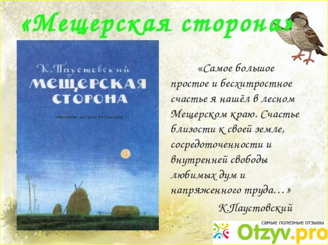 Однако, параллельно с героями книг, писатель описывает красоту родного края, так в «Мещерской стороне» она является предметом его любования, источником лирического вдохновения. Когда читаешь первые строки, то начинаешь понимать, как писателю дорог родной край, в котором он родился и всё то, что с ним связано.