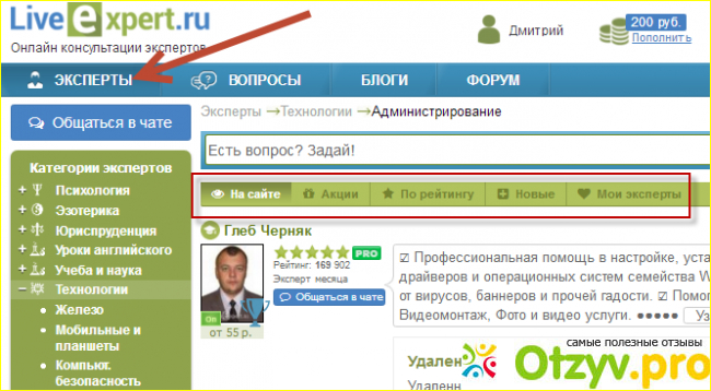 Например если вас интерисует опредленная проблема можете выбрать эксперта в нужной вам области: юриспруденция, бизнес и работа, магия, эзотерика и многое другое. Далее с интересующим вопросом можно обратится к самому опытному консультанту- сдесь выбираем по рейтингу. Чем выше рейтинг, тем наиболее опытен и востребованен эксперт, и его услуги зачастую не из дешевых, уже потому, что опыта у человека более чем достаточно. В разделе же новички также можете получить консультацию от проффесионалов, но возможно даже по дешевке или вобще бесплатно так, как начинающему эксперту нужно среди кучи конкурентов наработать свою клиентскую базу и рейтинг, поэтому и за услуги могут ничего не взять. А качество ответов подчас бывает не хуже чем у проффесионалов. Так, что регистрироватся можно и как пользователь, и как консультант, если у вас есть определенная база знаний. Я кстати и обращалась вопросом к новичку ответ получила краткий и понятный, который мне помог.