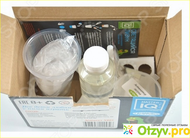 Вообще такой набор рекомендуется детям от восьми лет, но это наверное, если ребенок делает сам без взрослых. А там даже в четыре года мой ребенок был в восторге от этого набора и от лизуна, который у нас получился в итоге. Коробка не тяжелая, весит всего 231 грамм и ее размеры 18,5*10*12 сантиметров. Производитель такого набора - Россия.