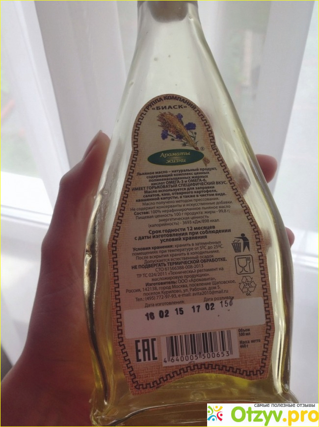 Но, к сожалению, в магазинах его часто продают в обычной светлой стеклянной бутылке. Сегодня в продаже есть льняное масло разного объема и с добавлением различным микроэлементов. Обычно с микроэлементами масло можно найти в аптеке. Например, лично я встречала там льняное масло с селеном. Как правило, мы берем масло объемом 0,5 л. Это по-моему, самый распространенный вариант упаковки. Кстати, после открытия бутылку лучше всего хранить в холодильнике. Поскольку при каждом попадании кислорода и солнечного света масла теряет свойства и уменьшается его срок годности. Потом оно становится очень горьким. Кстати, такие масло категорически нельзя употреблять в пищу. Если льняное масло сильно горчит, то скорее оно принесет вред, а не пользу.