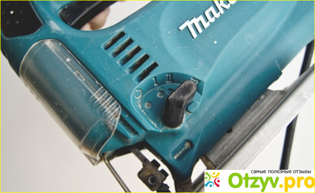 Что еще в Макита 4329 отличает его от других? Тут усиленная подошва, есть возможность выбрать определенную скорость, а ход лезвия трехступенчатый маятниковый.
