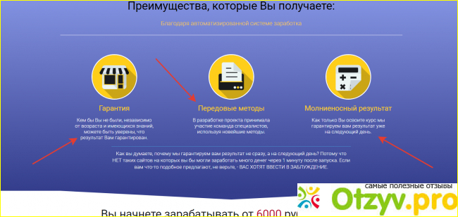 Автор проекта обещает весьма неплохой заработок на его модели - 6000 рублей в сутки. И это при том, что от владельца курса не потребуется никакой компетентности - только компьютер, начальный уровень владения им и время - всего 30 минут в день. Фактически получается, что работнику ничего не придётся делать, а просто получать доход и доход для данного вида заработка немалый.