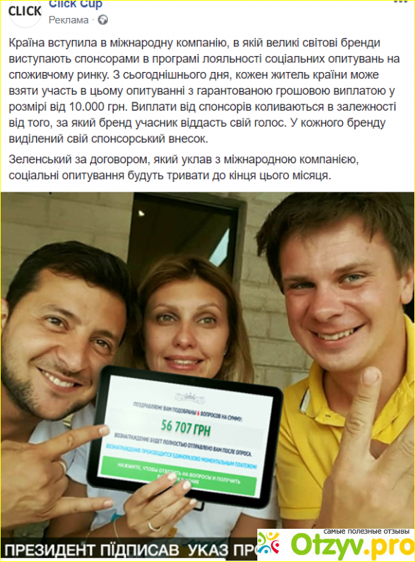 Как указано в постах, которые для авторитетности сопровождаются фотографиями президента Зеленского, телеведущего Дмитрия Комарова или счастливчиков с разложенными веером 500-гривневым купюрами, «страна вступила в международную кампанию, в которой крупные мировые бренды являются спонсорами в программе лояльности социальных опросов на потребительском рынке.С сегодняшнего дня каждый житель страны может принять участие в этом опросе с гарантированной денежной выплатой в размере от 10 000 грн.Выплаты от спонсоров колеблются в зависимости от того, за какой бренд участник отдаст свой голос.У каждого бренда выделен свой спонсорский взнос ».
