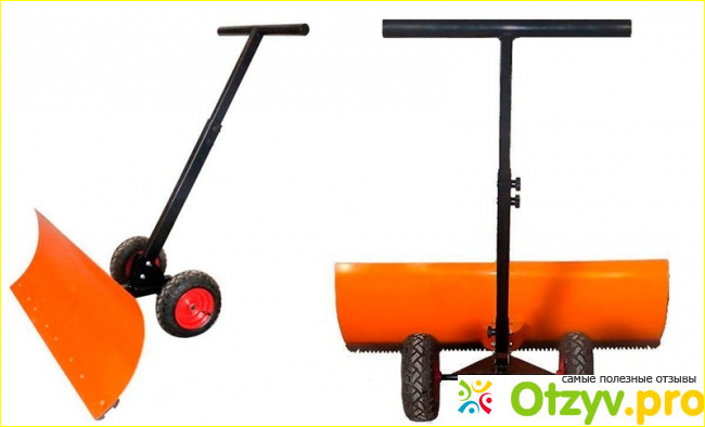 Сама лопата прикрепляется к раме при помощи специальных кронштейнов, сама же рама имеет колёса. Можно отрегулировать высоту ручки лопаты, а также её наклон под себя, чтобы было удобнее работать. Таким образом, становится легче лопатой управлять. В данном случае также регулируется поворотный угол отвала, возможно его фиксация в центральном положении. В итоге, когда убираешь снег, значительно меньше затрачивается усилий. Конструкция лопаты сделана так, что имеется специальный упорной уголок, таким образом когда производится движение, то не происходит врезание лопаты в снег. В итоге можно сказать, что с целью облегчения труда, здесь продумано всё до мельчайших деталей.