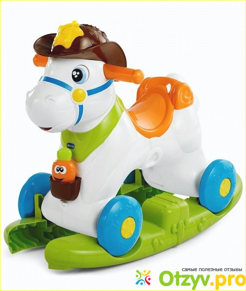 А ближе к полутора годам мы её смело оседлали и не слезаем с нее до сих пор. Эта игрушка помогает ребенку весело и с пользой проводить время даже в нашей двушке. Производитель указывает, что игрушка сделана из неопасных материалов. Считаю, что конструкция этой игрушки абсолютно безопасна, а дизайн просто отличный. Лошадка Чикко "Беби Родео" разнообразит игры вашего ребенка, так как он точно раз сто будет залезать и слезать с нее) Качалка легко превращается в самостоятельную каталку на колесиках, нужно просто отсоединить качающаюся часть, подняв лошадку вверх. Игрушка имеет звуковые и световые эффекты, которые раздаються при нажатии на определенные кнопки. Если лошадку обнять или погладить, она начнет закрывать глазки. У Беби Родео есть кармашек на груди, а в нем есть морковка, которой можно как - будто покормить лошадку, при этом у нее начинают мигать огоньки и она ржет от радости. Звук и свет активируются за счет 2х кнопок на корпусе. Подарком мы очень довольны. спасибо нашим кресным