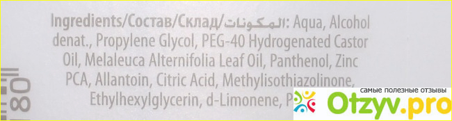 Сам лосьон прозрачный с запахом чайного дерева, которое входит в его состав и благодаря которому оказывается такое лечащее действие на кожу. Запах выражен не сильно. В состав средства также входят другие вещества, которые можно более подробно рассмотреть на фото