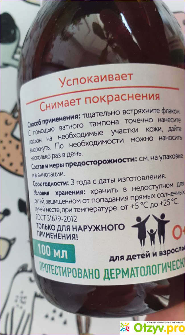 Флакон из темного пластика, с винтовой крышечкой. Упакован в картонную коробочку. Вся необходимая информация по применению, хранению, срокам годности имеется. По консистенции лосьон средней густоты. Наносила на папулы я ватной палочкой. Не растекается, в этом большой плюс. Во флакончике лосьон розового цвета, при высыхании становится практически белый. Смывается очень легко и быстро, одежду не пачкает. Зуд снимает сразу же. Мне кажется, что ребенок и не чесался вовсе. В отличие от старшей дочки не испытывал практически никакого дискомфорта. Это средство я наносила несколько раз в день.