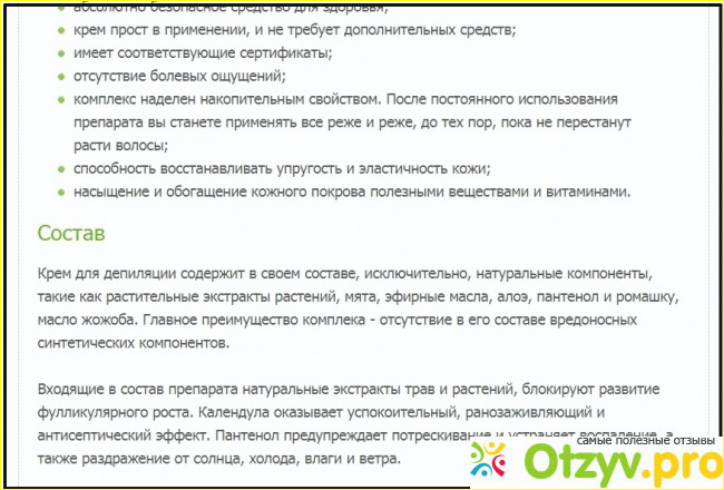Стоит учесть, что в составе крема не имеется синтетических компонентов, поэтому аллергических реакций не должно быть, ведь тут лишь натуральные компоненты. Здесь имеются экстракты растений, пантенол, а также эфирные масла. Поэтому такой состав позволит избавиться от лишнего волосяного покрова разным женщинам, у которых различный тип кожи, ведь противопоказаний не существует. Но для этого нужно покупать этот крем в специализированных торговых точках, чтобы вам не подсунули подделку.