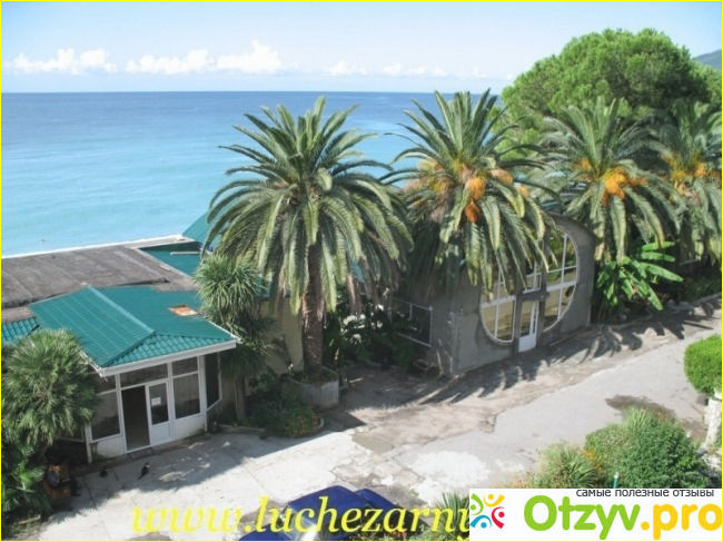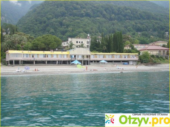 Данный пансионат находится на самом побережье черного моря, а также совсем недалеко от знаменитого парка и легендарного ресторана, названного в честь великого Гагра. На территории пансионата посажено много экзотических деревьев и растений, поэтому большая часть пансионата находиться в тени, и это великолепно. Днем вам не придется изнывать от жары, вы сможете наслаждаться тенью и запахом вечнозеленых деревьев постоянно. На всей территории пансионата установлено видеонаблюдение, поэтому уходя на пляж или на прогулку, вы можете не переживать за свои ценные вещи, оставленные в номере и спокойно насладиться и полностью отдаться отдыху в чудном городе. Сам пансионат находится практически у моря, поэтому прямо из окна вы можете любоваться прекрасным видом, а также созерцать прекрасные закаты и рассветы, а они там, уж поверьте мне, просто великолепны. Также вам не придется делить пляж с обычными горожанами, ведь у пансионата есть своя огражденная территория пляжа. Пляж очень чистый, поэтому я не боялась отпускать ребенка играться на берегу, так как там не было, стекол, окурков, бумажек и прочей опасной ерунды. У пансионата также есть своя столовая, в которой обеспечивают вкусное и достойное трехразовое питание. Меню каждый раз менялось, блюда не повторялись, готовили очень вкусно и подавали еду в чистых тарелках, и с чистыми приборами. Если вы что-то не кушаете или просто хотите попробовать определенное блюдо, то вы можете высказать свое пожелание и сделать индивидуальный заказ. Если вы приехали отдыхать в пансионат на своей машине, то вы также можете не переживать за её сохранность, так как в пансионате есть своя охраняемая стоянка. Хочется еще отметить, что номера были очень комфортные, просторные, убирались во время. Звукоизоляция очень хорошая, а так как ребенок спит очень чутко, то для нас это было очень важно. За пределами пансионата тоже очень чисто, сразу видно, что господствующие власти беспокоятся о туристах и их впечатлениях от города.