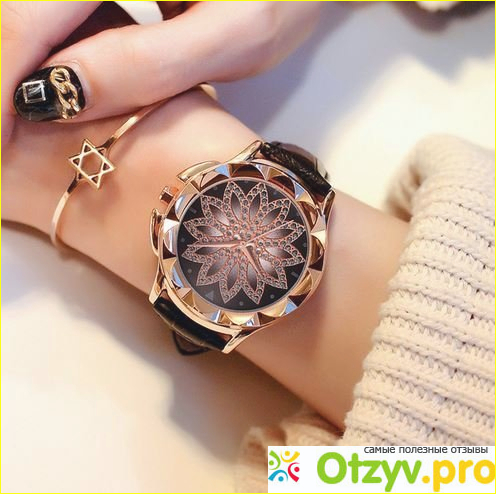 Интересный металлический под золото корпус. На нем ажурные выступы, напоминающие лепестки цветка. Внутри циферблат тоже выполнен в виде 12-ти цветочных лепестков. Каждый кончик лепестка указывает на цифру. На боку есть специальные выступы, которые защищают колесико завода от ударов и повреждений. Работают часы на батарейке. Плюс продавец позаботился о приятном сюрпризе и дарит еще одну в подарок. По размеру циферблат крупный. На руке смотрится нарядно, но больше подходит под брюки и свитер, чем под вечернее платье.