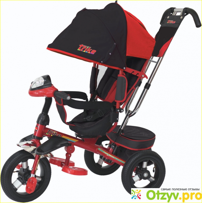 Высокая рама и крупные надувные колеса делают этот велик практически вездеходом. У него отличный дизайн, напоминающий гоночный мотоцикл, поэтому модель очень нравится мальчикам. Отличается средство повышенным удобством для малыша. У него удобная большая спинка, которая защищает от холодного ветра и позволяет полностью облокотиться. Присутствует обод для страховки и еще дополнительные ремни безопасности. Впереди на руле работают фары. Ручка для родителей регулируется по высоте. А в козырьке сзади есть окошко, чтобы родители видели, что делает ребенок.