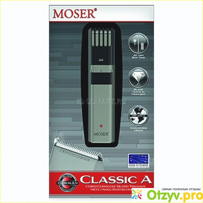Цена в пределах двух тысяч гривен, нам это подходило и мы естественно его купили. Этот тример от всех отличался элегантным дизайном и эргономичным корпусом, он приятен и удобен в эксплуатации. В его характеристиках было описано что он неимоверно легкий так как его вес всего 120 г, а благодаря какому то там мотору он отличается еще и од других тримерров тем что он очень тихо работает. Он делает срез длиной 0,4 мм обеспечит 32 мм ножевой блок из легированной стали, основные элементы которого закрыты от попадания срезанных волосинок. Быстро и без усилий происходит замена лезвий происходит . Триммер Moser имеет в своем арсенале 3 режима мощности для работы с волосами которые имеют различную толщину и структуру. Работатьможно как подключив инструмент к сети, так и в автономном режиме - встроенный Li-lon аккумулятор рассчитан аж на 1,5 часа, что нас очень привлекло, ведь наш мужчина очень часто ездит по командировкам и ему этот триммер очень был бы к стате.