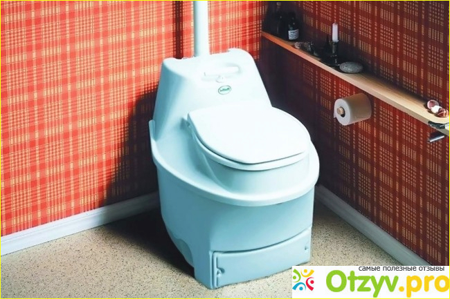 Выполнен из прочного пластика по корпусу, хорошо выдерживает низкие температуры и удары. В процессе использования его наполняют специальным торфяным составом. который позволяет перерабатывать отходы и блокировать запах. В комплекте идет торфяной наполнитель в объеме 20 литров. Также есть сепаратор, вентиляционная труба и шланг. Это компактное устройство стандартной высоты сидения, подходящее большинству людей.