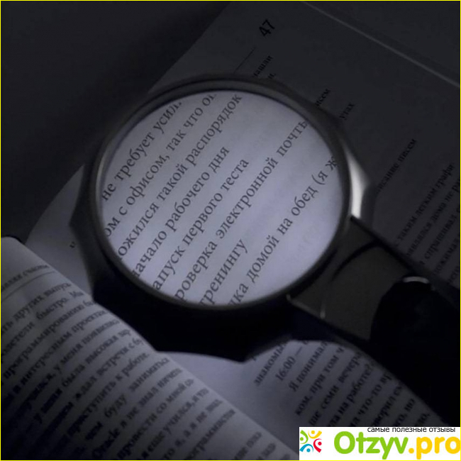 Увеличение в 6 раз, возможность не просто разглядеть предметы в темноте, но и читать тексты. Вокруг линзы располагаются светодиоды, которые и освещают объект или текст.