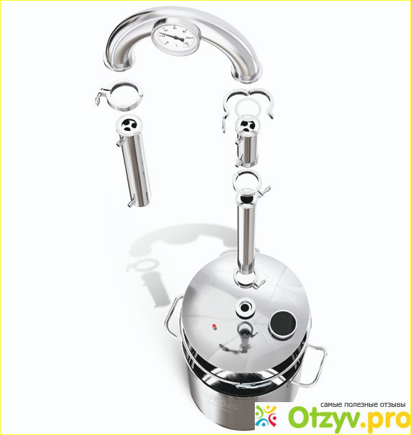 Самогонный аппарат состоит из обыкновенной кастрюли и колонны со всеми прибамбасами (термометры, манометры, охладитель, сетки, клапан, прокладки), такой аппарат сертифицирован и не вызывает опасения (работает под высоким давлением), есть возможность выбора объема (двенадцать, тридцать, пятьдесят литров), мы купили на тридцать литров за девять тысяч девятьсот девяносто рублей.