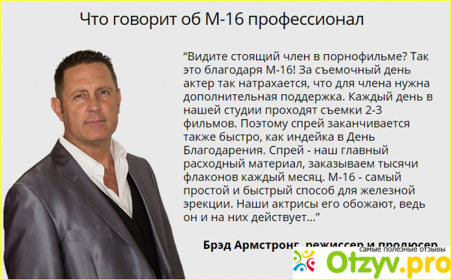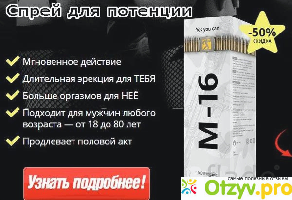 Кто-то пишет, что это всего лишь способ вырвать деньги из рук людей, а кто-то, как и я оставляет положительные отзывы о данном препарате. И действительно эффект уже приходит после первого применения, довольно экономичный расход средства. Достаточно всего лишь пару пшыков сделать и можно наслаждаться качественным оргазмом на протяжении длительного периода. Любое средство не будет эффективно, если не стимулировать свой половой орган. А хорош М-16 еще тем, что он усиливает эрекцию не только у мужчин, но и у женщин.