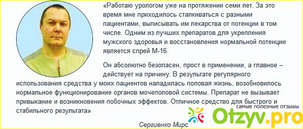 Про спрей м 16 я знаю немало - могу с уверенностью сказать, что вреда он не принесет. Не стоит забывать, что все процессы в организме протекают индивидуально - у кого-то спрей действует за 5 минут, у кого-то - за 15 минут. Но то, что спрей действительно приносит положительный эффект - крепкую эрекцию, это абсолютная правда.