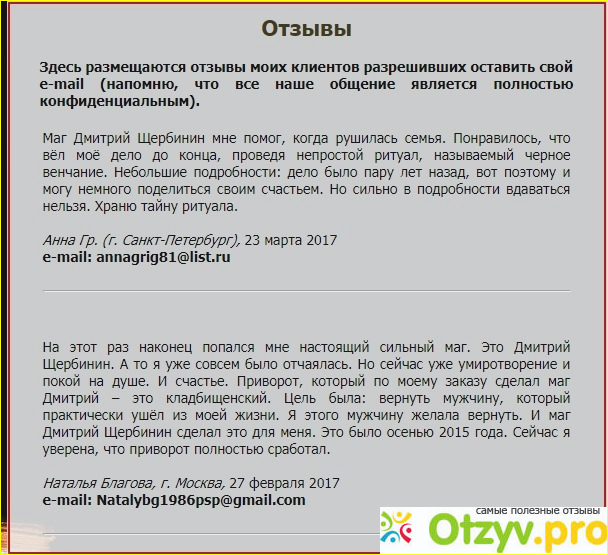 Здесь же можно узнать о положительных отзывах тех, кто якобы воспользовался его услугами и остался доволен.