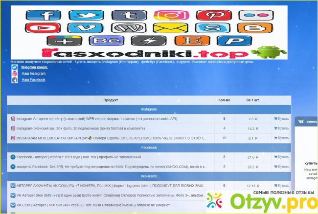 О сайте rasxodniki.top узнал на форуме античата-решил попробовать в своей схеме. На сайте представлено большое количество аккаунтов разных платформ соцсетей. Регать самому утомительная затея и трата на смс номерах, так как по работе требуется много аккаунтов на площадках вконтакте и инстаграме.