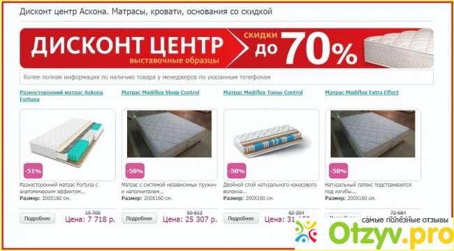 Выбрав нужную модель, можно прочитать очень детальную информацию о материале и других параметрах матраса, а также адрес магазина, которые предоставляет скидку по этой модели. Есть и телефон, чтобы договориться о заказе.