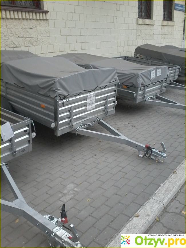 Перед входом в магазин стоят автомобильные прицепы.