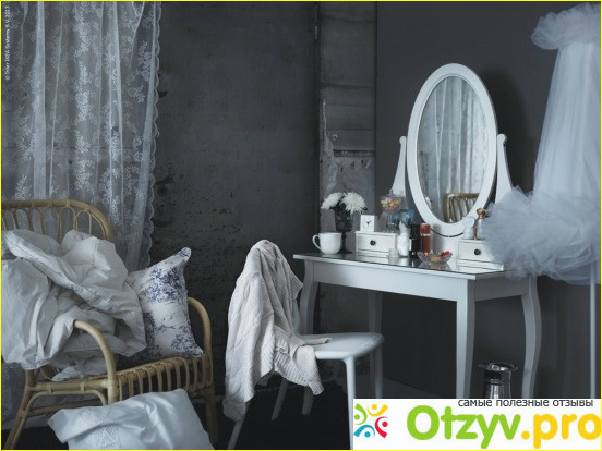 Особенностью этого комплекта является шторы, тюль которая входит в набор, а также туалетный столик который мне не нравится. Но, внешне он сочетается с цветовым решением, и выглядит как компактный и удобный, хотя я бы к примеру его бы совсем не купила.