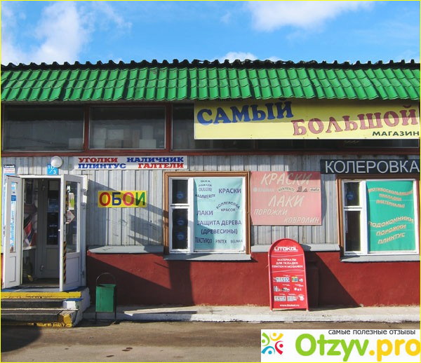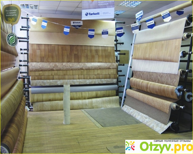 В теплое время года бывают открытыми две двери, потому что магазин действительно очень большой. В нем два или три зала, в которых располагаются высокие металлические стойки с рулонами линолеума.