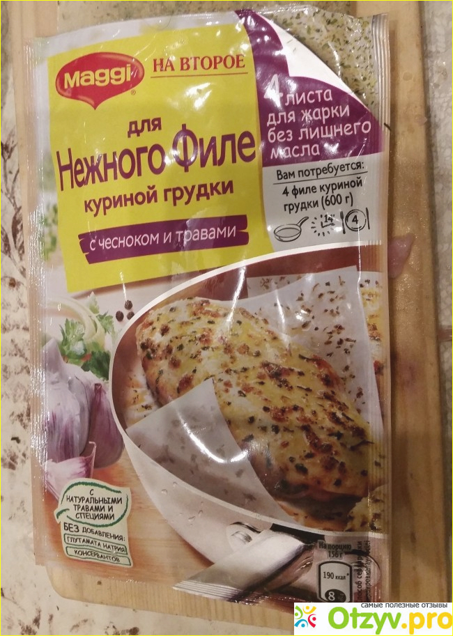 И всего-то для счастья надо приобрести пакетик "Магги на второе для нежного филе куриной грудки", в котором находятся четыре листа специальной непроницаемой для жира бумаги, уже заранее обработанной ароматными травами, луком, чесноком и специями. Все эти ингредиенты являются натуральными, в составе, которым обрабатываются листы для жарки, отсутствуют консерванты. Глутамата натрия - усилителя вкуса - здесь также нет. А что же в них есть? А есть там петрушка, перец, мускатный орех, томат, базилик, куркума, а также подсолнечное масло.