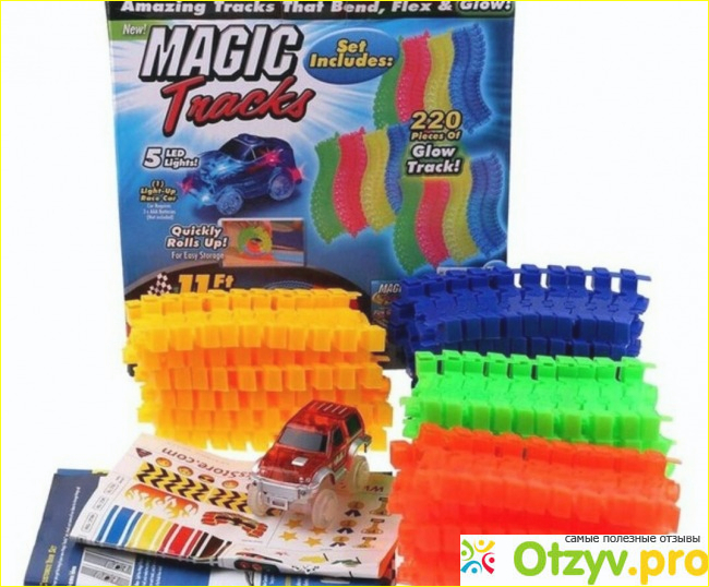 Так же как в первом так и во-втором наборах были инструкции на английском языке и наклейки в наборе. Сейчас я нашла в интернете специальные трассы с аксессуарами, например различными мостами и подъемами. Эти трассы на много интереснее чем наши. Но они появились совсем не давно. А что касаемо цены, то я считаю, что не нужно переплачивать деньги за якобы оригинальные трассы Magic tracks так как от дешевых вариантов они практически ни чем не отличаются.