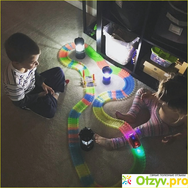 Кстати когда я покупала ребенку его первый гоночный трек, то ожидала, что сама трасса будет светиться в темноте. Причем я думала, что она будет достаточно яркой. Но на самом деле практически ни какого свечения и нет. Она вообще не заметна в темноте, а светится только когда по ней едет машина. Так как когда она включена, то спереди у нее есть лампочки.