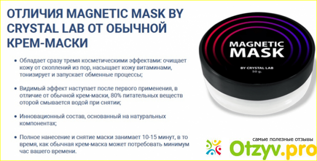 Микроскопические магнитные частицы, вытаскивают загрязнения из забитых пор. Проведенные исследования показали, что такие элементы намного эффективней и безболезненней чем, например ультрозвуковые пилинги. Сама процедура не травмирует кожу оставляя ее чистой, в отличие от салонного пилинга. Купив себе такой средство, можно существенно сэкономить на косметологе. Также можно перестать использовать «бабушкины» рецепты омоложения, которые зачастую не только длительны, но и трудоемки. Основные преимущества магнитной маски таковы: