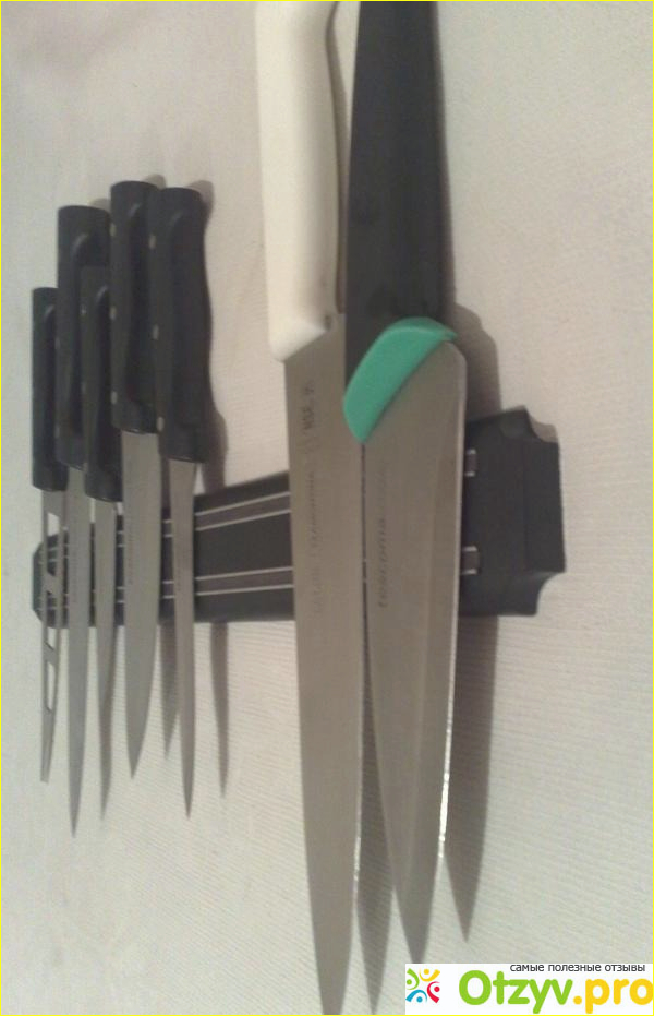 Кстати, на магнитный держатель помещается достаточно много ножей, как и в классической подставке. Да и видно сразу где какой нож, какой вам нужен, вы не будетие играть в лотерею, вытаскавая нож по очереди в поисках нужного вам.