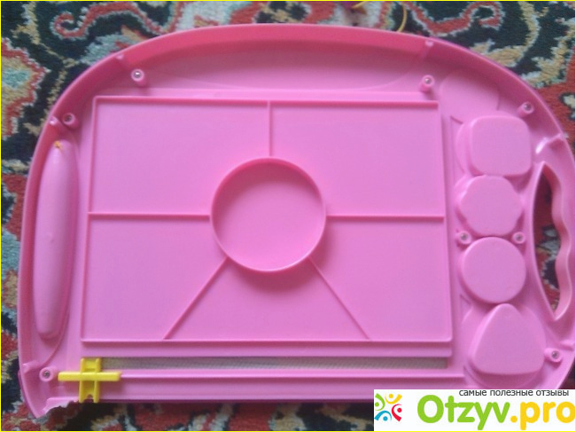 В наборе шли четыре магнитные геометрические печати в виде треугольника, квадрата, круга и цветочка. Печатают хорошо видно все контуры четко. Экран у доски цветной то есть поделен на четыре равных прямоугольника и каждый из которых имеет свой цвет , синий, красный, зеленый и какой то непонятный либо грязно-желтый либо светло -коричневый. При первом же использовании начал заедать ползунок для стирания. А через пару месяцев так и в обще отломилась его нижняя часть за которую надо держаться вместе с нижней частью доски по которой он ездил. Теперь стираем держа его с нижней стороны доски неудобно конечно , ну хоть так можно пользоваться так как доска очень нравиться дочери. Цветной экран на ней хороший уже почти за год службы ни чего с ним не случилось, не отслоился , не потрескался. Магнитный карандаш удобный фиолетового цвета, привязан за шнурочек к доске , рисует хорошо не царапает. В общем впечатление от доски хорошее, жаль что поломался ползунок быстро . Фотографии после года эксплуатации .
