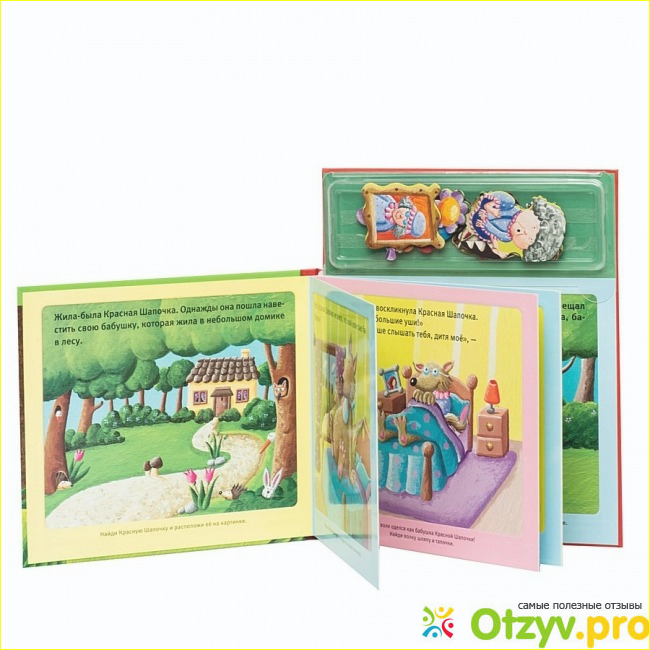 В самом верху у книжки идет специальный прозрачный отсек, который закрывается прозрачной крышкой. Как раз в этом отсеке и находятся магнитики. Их достаточно много. Сколько я вам уже сказать не могу, но больше десяти. Каждый магнит спереди имеет яркую картинку по сказке, а вот с обратной стороны у него идет уже сам мягкий магнит. Каждая страница в книжке так же магнитная. По этому все магнитики к ней легко прикрепляются.