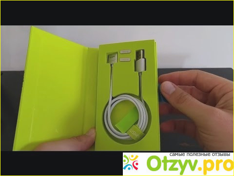 Поставляется зарядка в закрытой упаковке. Открыв крышку можно увидеть сам кабель, который смотан и закреплен специальным держателем. Этот держатель многоразовый, поэтому если вам не нужна метровая длина, вы всегда сможете скрутить часть кабеля и закрепить его.