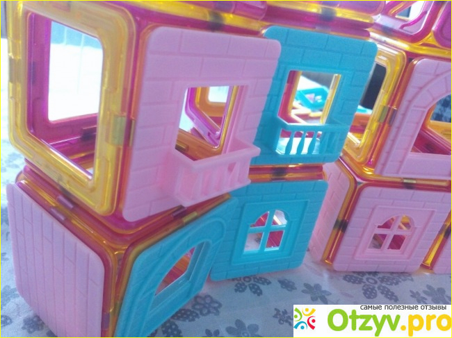 Кроме магнитных деталей есть пластмассовые детали, которые вставляются в магнитные квадраты. Они сделаны с окошками, балконами и с кирпичным узором, это придает построенным замкам действительно законченный вид дворца.