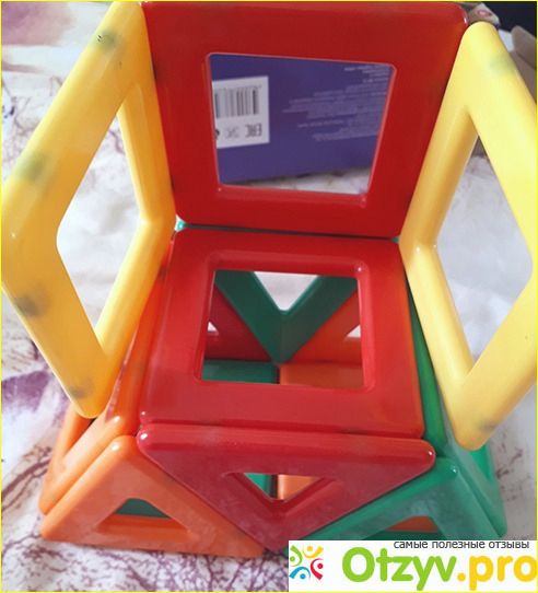 Магниты находятся внутри и запаяны накрепко, разбить или разобрать элементы, чтобы достать магнитик, невозможно. Малышка играет конструктором и извлекает звуки из треугольников и квадратов с удовольствием. Особенно ей нравится магнитить их между собой и отрывать от поделок фрагменты, что я только приветствую, как полезные упражнения для ручек.