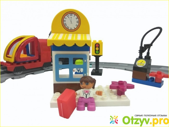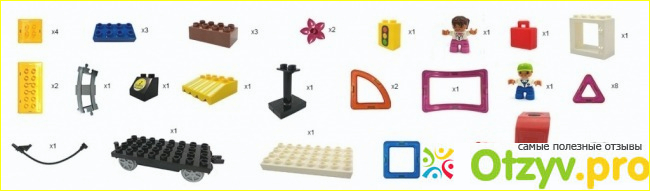 В наборе 68 деталей: магнитные для поезда, и пластиковые для дороги, железнодорожной станции и заправки и два пластиковых человечка.
