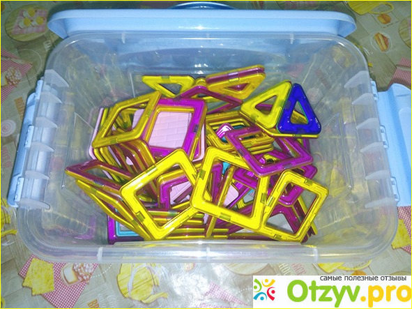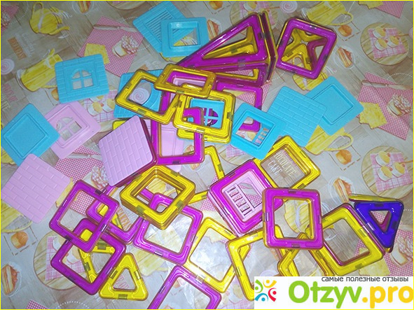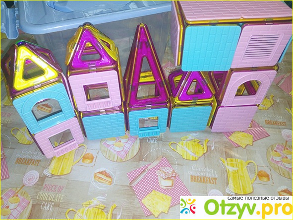 Детали цветные, яркие, гладкие и очень прочные, соединяются между собой моментально. Дом легко, не рассыпаясь на фрагменты, передвигается с места на место, выдерживает наплыв «гостей», быстро достраивается, если вдруг всем не хватило места. Магниты сильные, сцепка между элементами отличная.