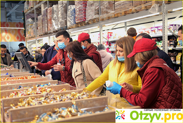При входе, клиентов, встречает большая новогодняя ёлка, и охранник, который выдаёт одноразовые маски. На торговом оборудовании, представлено невероятно большой ассортимент товаров от местных, и международных производителей.
