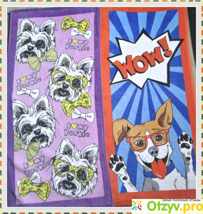Полотенца в разном дизайне, и оба мне очень понравились. Размеры у них одинаковые: 34 на 76 сантиметров. Они односторонние, но не тонкие, скорее средние, для своего качества. С лицевой стороны смотрятся очень эффектно. Яркие и насыщенные расцветки, с нарисованными мордашками собачек, добавляют отличного настроения и позитива.