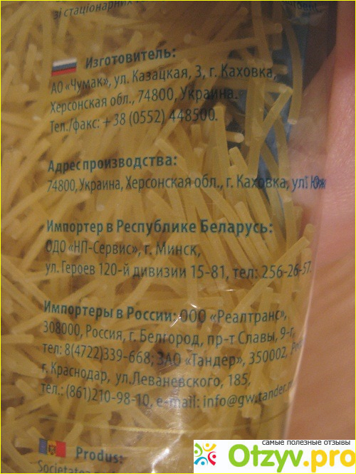 Производитель вермишели «Чумак» - это Украина, а если быть точнее, то Херсонская область. Тут есть адреса и импортеров в другие страны, всё это можно увидеть у меня на фотографии.