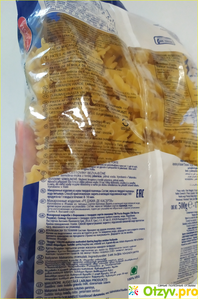 Макароны произведены в Италии, и их качество действительно европейское. Макароны в форме спиралей, они все одинакового размера и целые. Варить эти макароны нужно немного дольше чем из обычной мягкой муки, где-то минут 10-12.