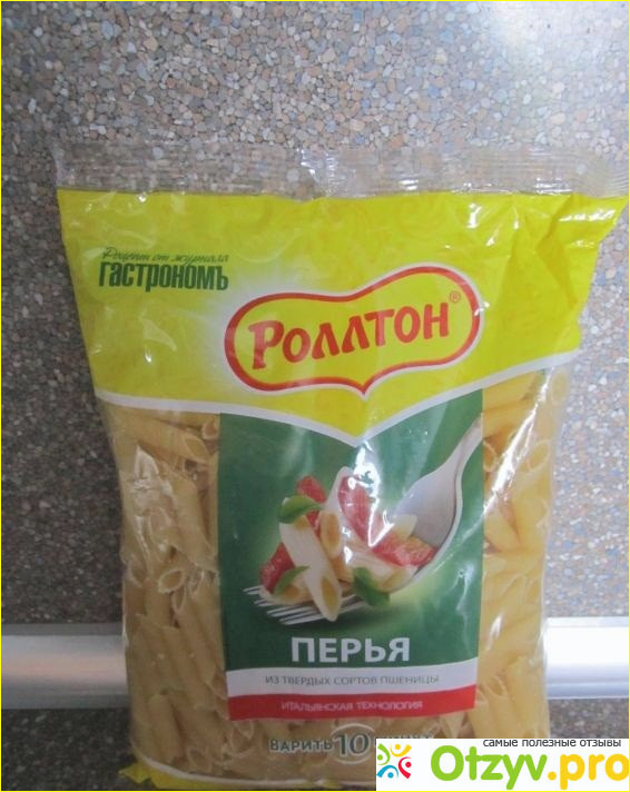 Очень яркая и узнаваемая пачка от Роллтон, пакет полупрозрачный через который мы можем видеть сами макароны, так называемые перья. Производитель сразу дает нам информацию о том, что макароны приготовлены и твердых сортов пшеницы и по итальянской технологии.