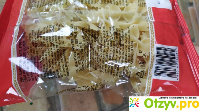 Пакет прозрачный, перед покупкой видно как выглядит продукт, можно рассмотреть не поломанные ли макароны.
