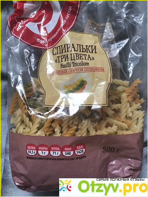 Они сделаны из твердых сортов пшеницы, что, в общем-то полезно. Хотя написано, что надо варить 7 минут, я немного дома отвлеклась и варила где-то около 10 – все равно спиральки не разварились и не слиплись. Само по себе тесто – приятное на вкус. Всем дома такие макароны понравились. Теперь стараюсь покупать именно эту марку – в семье любят этот вид цветных спиралек.